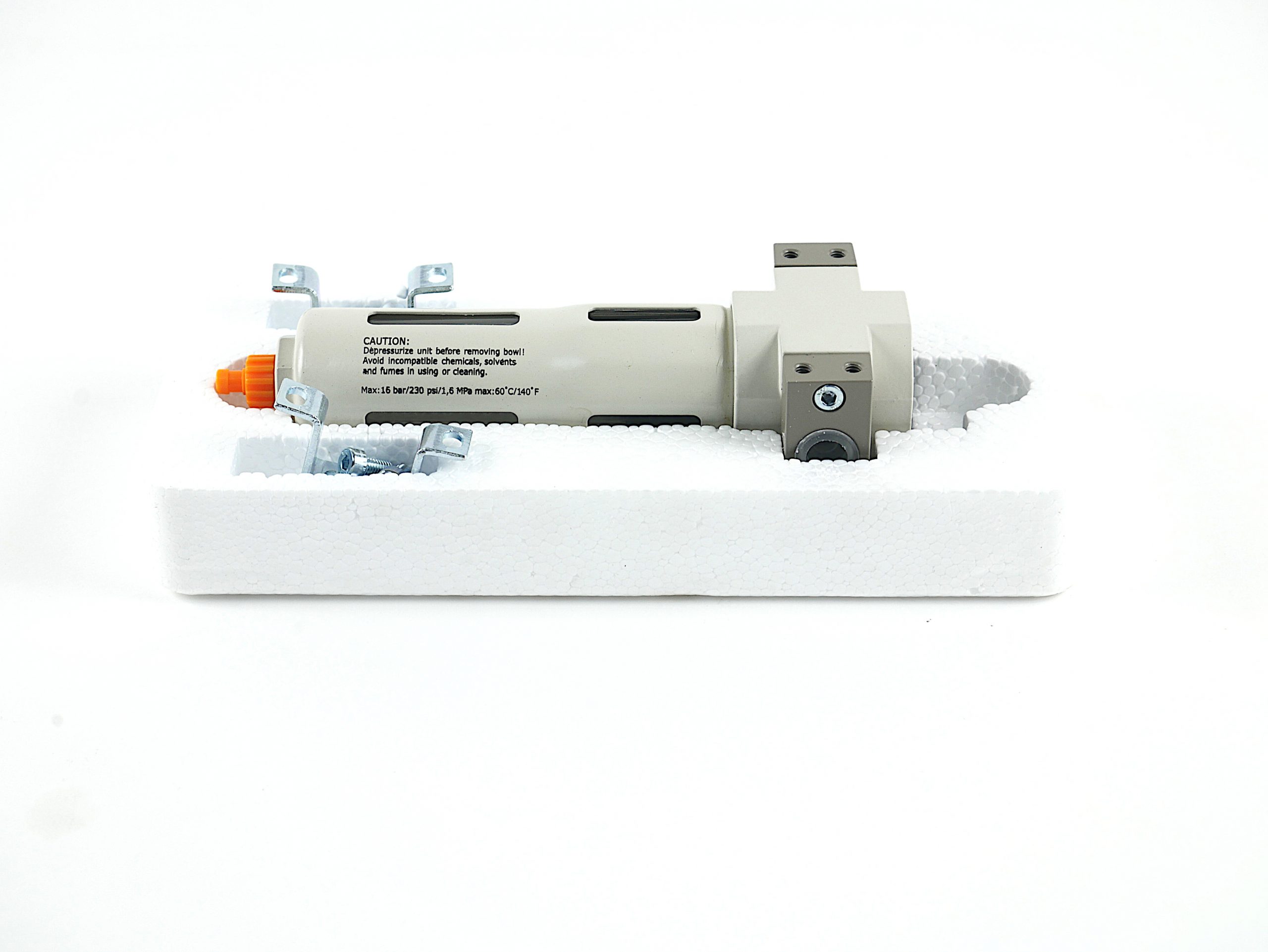 Reduktor i filtr do sprężonego powietrza wychodzącego ze sprężarki tłokowej.